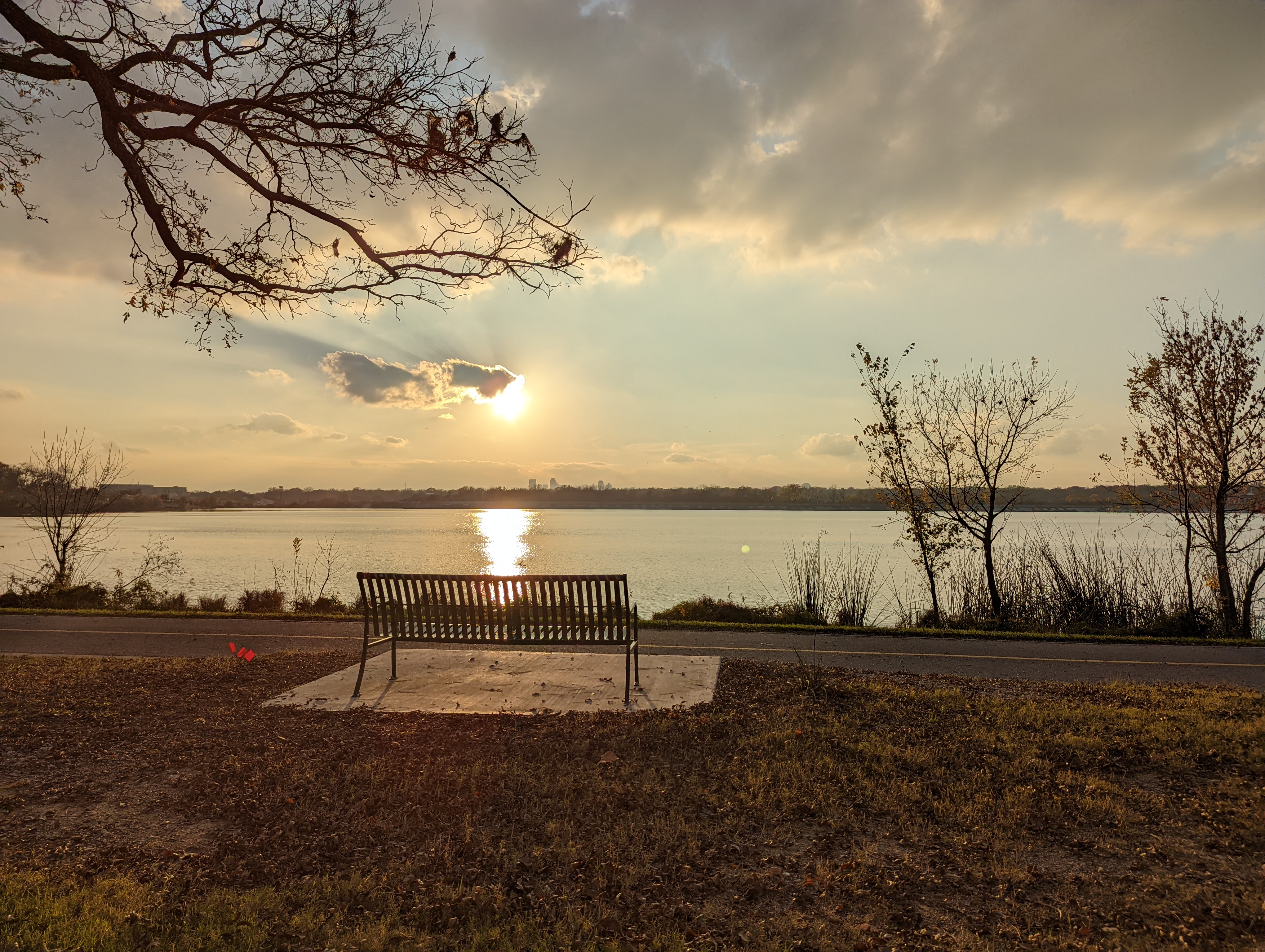 Keywords: outdoor water lake park grass bench skyline dallas white rock lake