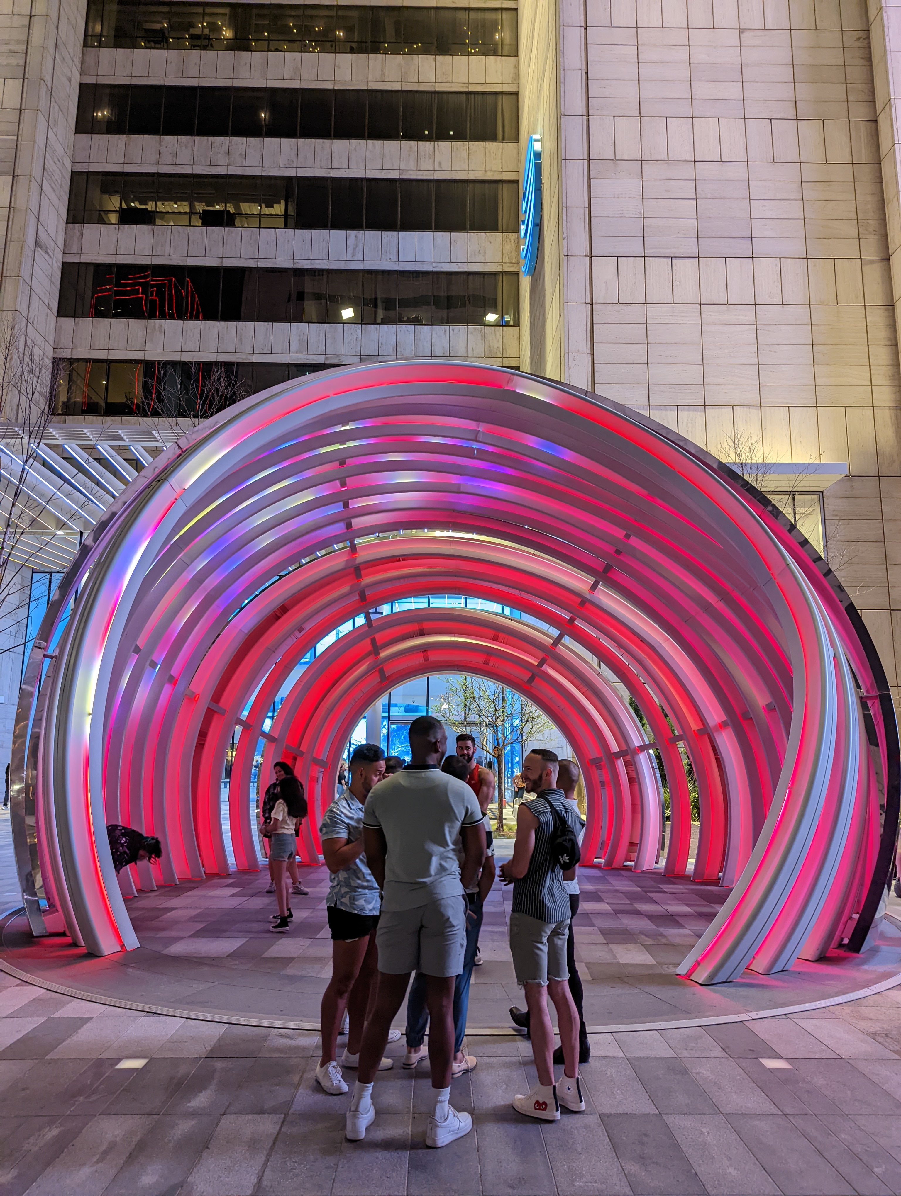 Closely resembling the AT&T logo, this 30 foot sculpture features 300,000 LEDs and a smooth mirrored finish that looks great day or night. The West opening is large enough for a group photo and the sculpture tightens towards the East for a unique shot within the structure as well.