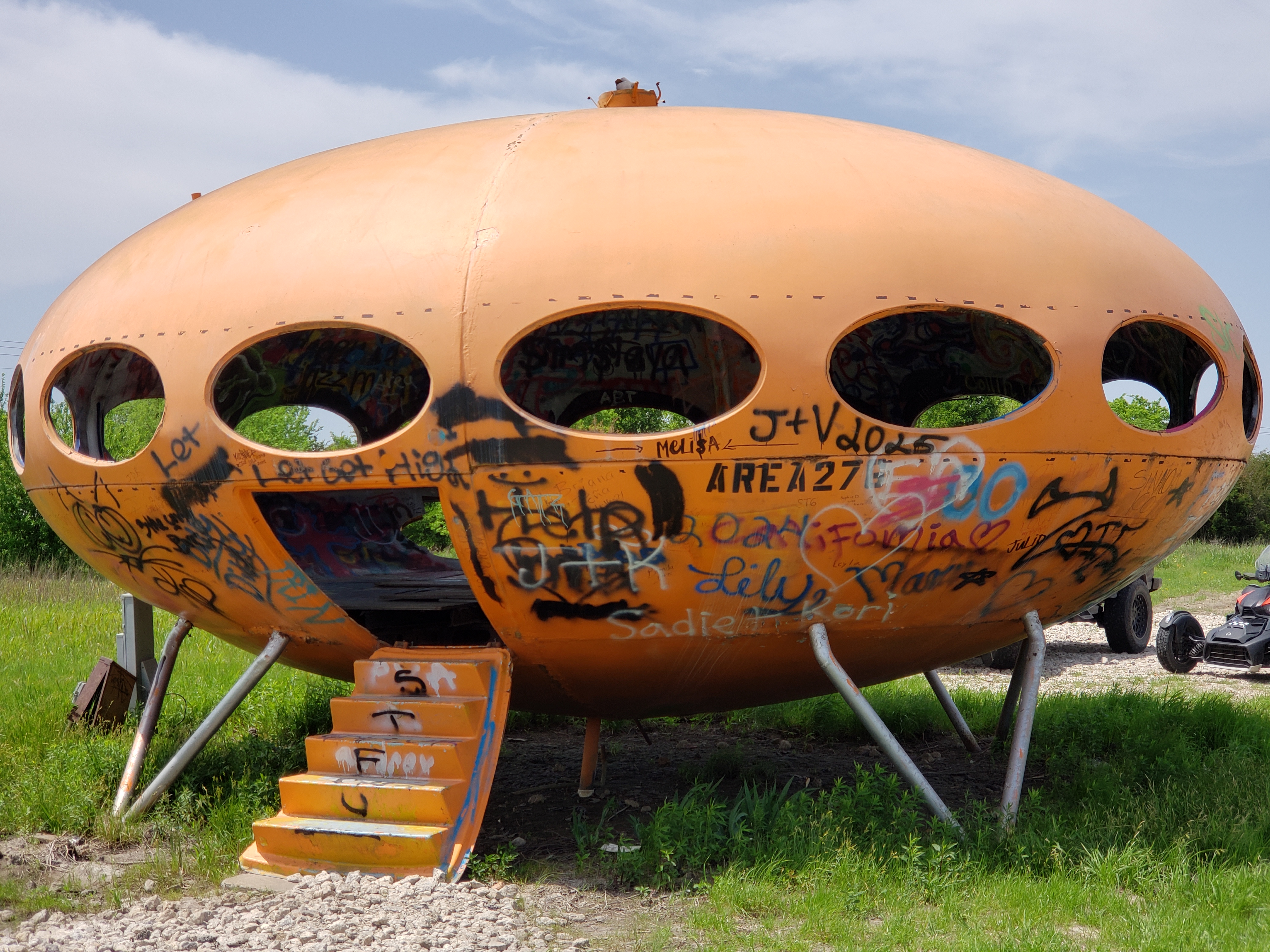 The Futuro House in Royse City, Texas, is a fascinating example of mid-20th-century architecture, known for its distinctive UFO-like design. Designed by Finnish architect Matti Suuronen in 1968, it was intended as a portable, prefabricated dwelling, embodying the era’s optimism about space and technology. With only about 60 of these structures left globally, it’s a rare sight, located along State Highway 276 in a rural Texas setting.