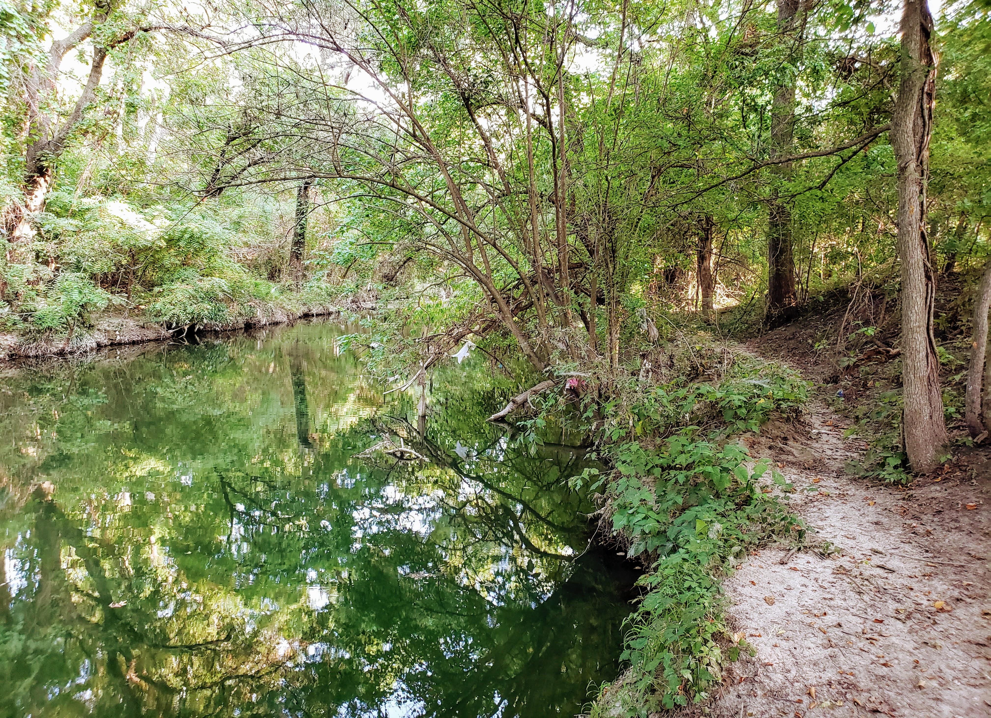 While the main attraction at Prairie Creek Park is the waterfall, there are a number of other spots nearby that are great as well including this little secluded section of the creek accessible from the West side not far from the waterfall and bridge. When I visited, the water appeared to have blue dye to make the water a vivid blue against the green trees.